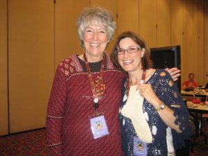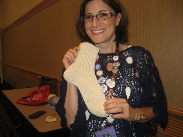 With Meg Swansen. I am wearing her design, the Mananita lace poncho. I remember knitting it. In order to create the big holes, you increase 18 times into one stitch. It takes a leap of faith to knit this, but Meg never leads you astray. The icelandic yarn stretched, but never broke. Notice that she is keeping close to me while I hold the EZ sock. I don’t blame her!The sock I am holding was knit by Elizabeth Zimmerman! It is the sock with the shaped arch, and this shaping makes the most comfortable sock, ever. I still can’t believe that I got to hold an EZ artifact. It should be in a museum! Sock Summit was filled with this kind of moment. I still can’t get over it.This captures the first time I met Ann Budd. She happened to be in a class, I recognized her and got all fan-girly, and she let me take her photo. Now I am working with her as she edits my book-in-progress. I’ll bet she doesn’t even remember this!