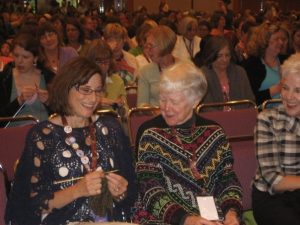 Sitting next to Barbara Walker! Barbara is wearing a sweater knit with Mosaic Knitting, a technique that she invented. I was knitting a Nancy Bush design, an Estonian shawl. Every time I wear it, I think of this moment.
