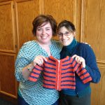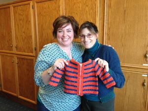Julie knit a baby sweater “on Tuesday” as a swatch for class, and left class with a completed project!