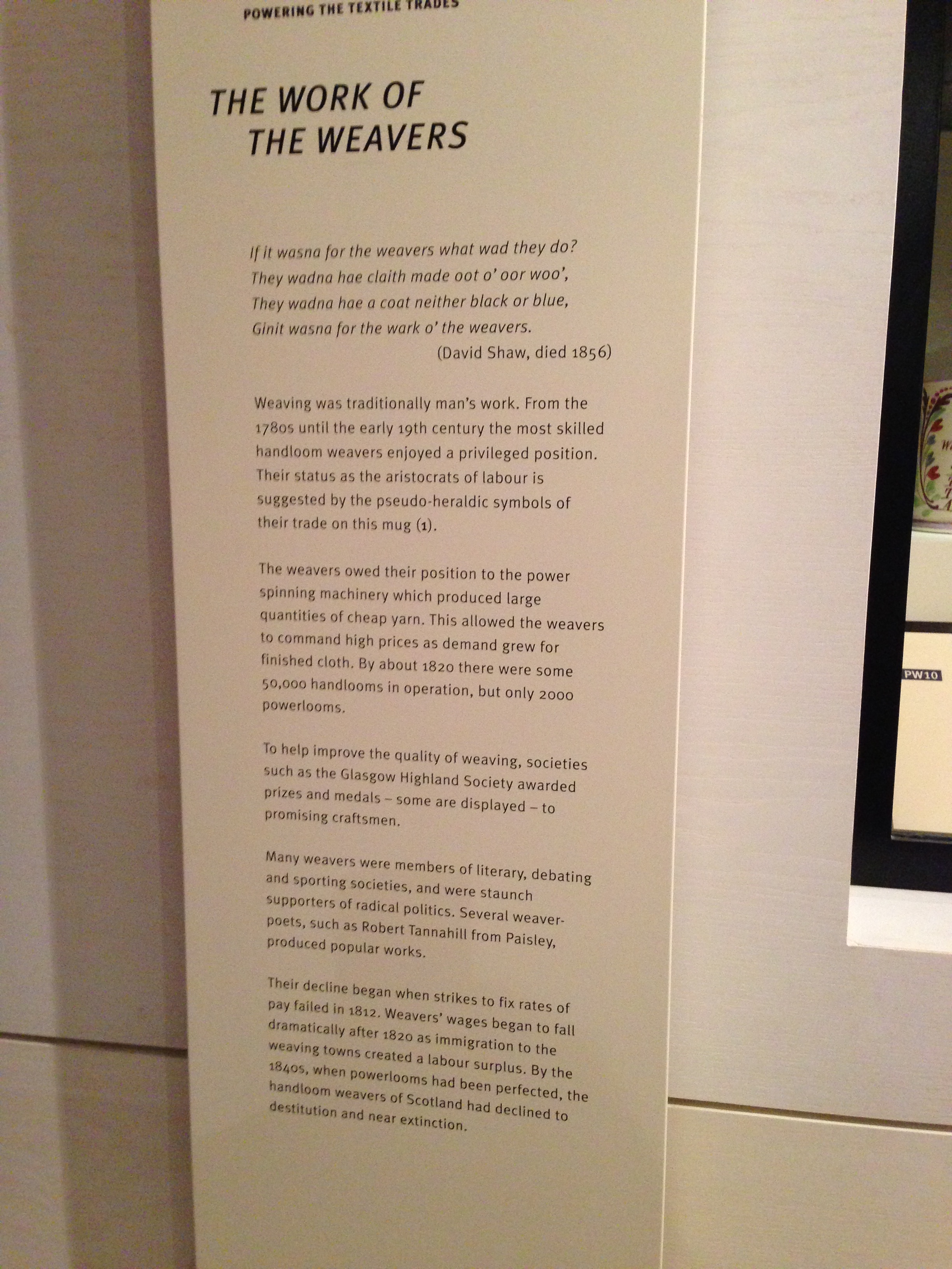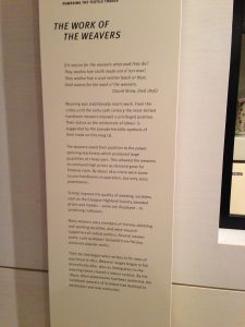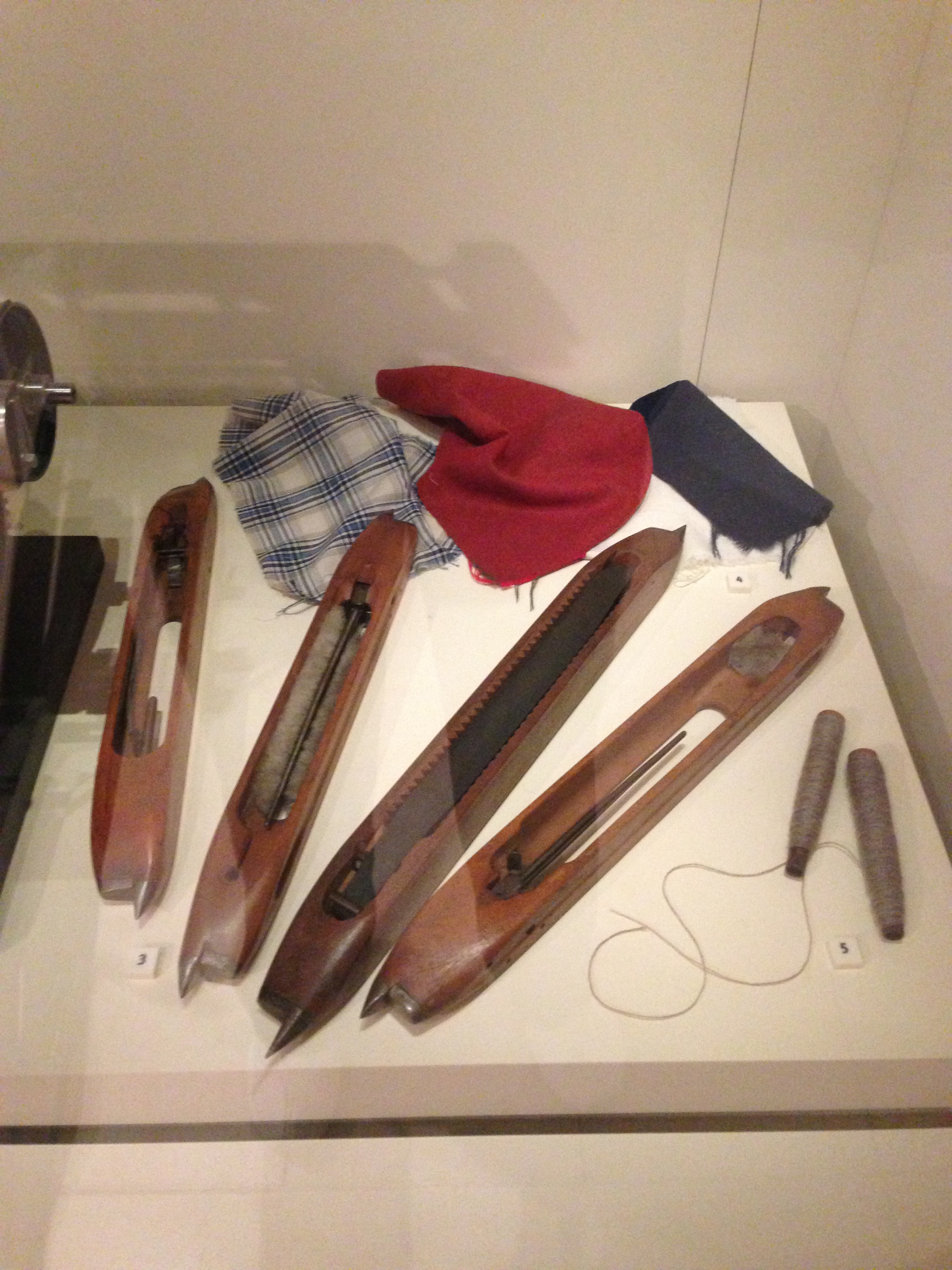 Scotland is known for wool, and tartan cloth. Their weaving history is justly recognized as being unique and rich. I am very new to weaving, but have come to have an appreciation for the complexity of the process, and the need for lots and lots of tools. Obviously, knitting is a more portable craft, but weaving is ridiculous. I’m a beginning weaver, and I have already filled a room with stuff. Considering how inexperienced I am, it was interesting to see tools in a museum which looked very familiar. Knitting tools have changed enormously in the past 200 years, in design and materials used. In contrast, weaving is a very stable craft. We have metal heddles now, instead of hand-tied string. Other than that, I didn’t see many changes. The complexity and quality of the cloth was pretty dazzling to someone who has trouble keeping her selvedges even. The exhibit was very inspirational.