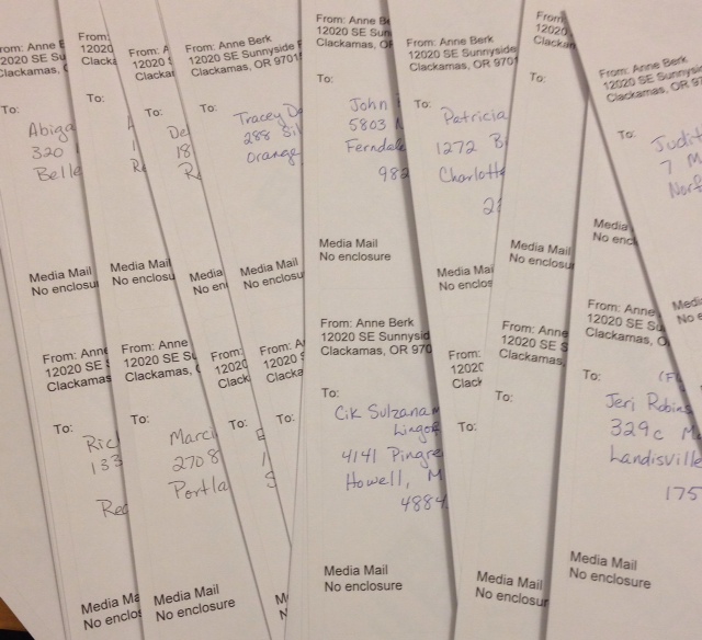 Then, of course, the call from Unicorn changed everything. I arranged to have books immediately freighted to me, and they are scheduled to arrive on Monday. I kicked into high gear and got the last of the mailing labels addressed for the pre-ordered books. Tonight I broke the news to Bill that we had to find room in the car for 6 cases of books. Plus the bubble bags for mailing. Bill, being the best husband in the world, only skipped a tiny beat before saying, “I guess we will need to take the Jeep” (the biggest car we own).