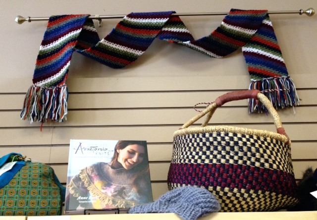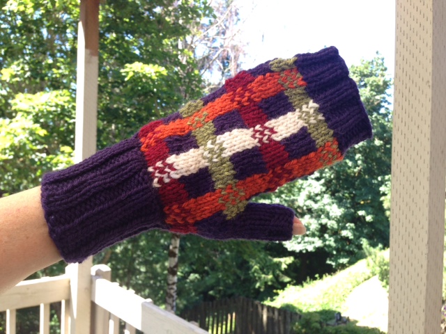 Here is how they displayed the Dizzy scarf, isn’t it pretty? And that reminded me that I hadn’t shown you the finished Craftsy plaid mitt that I knit using the scarf leftovers. I’m going to be stylishly warm this winter!