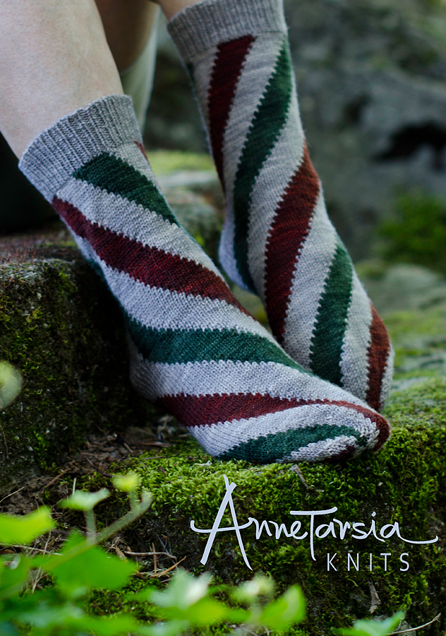 For the book, I used fewer colors, to limit the number of skeins needed. But every one of the stripes can be knit in a different color, with Annetarsia.  And I thought that would be fun.  I asked Kate to help me by creating a kit of 8 colors, so that with one kit (totaling 400 yds), a knitter could make a pair of sock with 8 different colored stripes, all coordinated with her stunning colors.