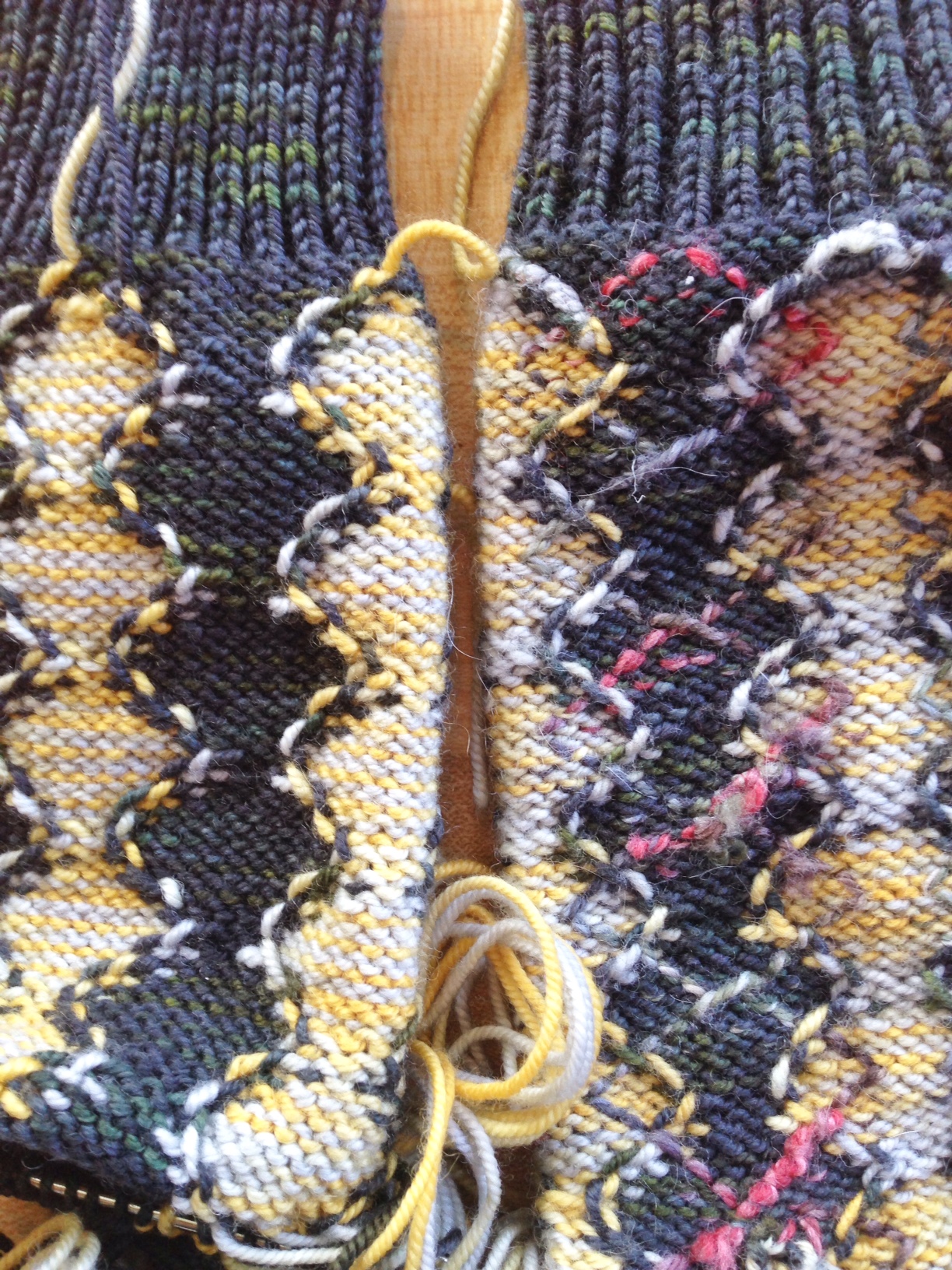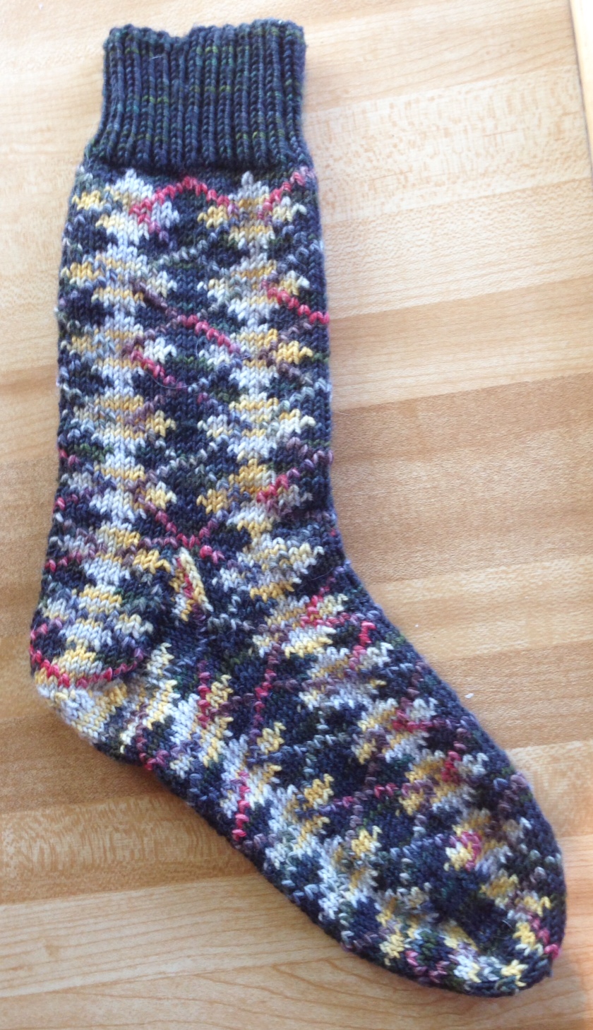 A few years ago, I was challenged (by Tina Newton, who has the best ideas….) to see how much of a sock I could cover with argyle patterning, now that it is possible to work ITR. This sock was the result.