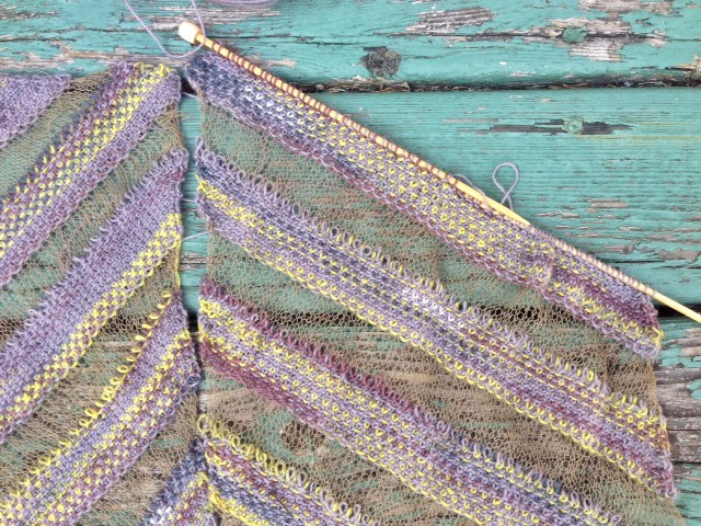 My current PKP is Diagonal Ribbons, from Knitters 112, knit with yarn I bought at Stitches West back in Feb. 2014.  I blogged about starting it here, on June 23.  Since then, I’ve worked on several different projects, but all having to do with class preparation or Annetarsia.  That has been enjoyable enough that I haven’t really felt deprived, but eventually it will catch up with me, and I have to do better.
