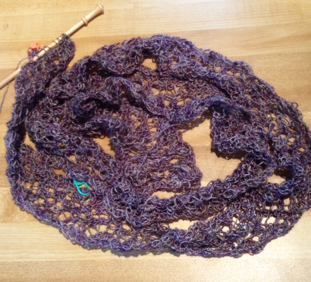 On the plane flight, I kept plugging away on the lace edging for the Rock Island shawl.  Long experience has taught me not to despair at the appearance of unblocked lace.  But this looks truly dreadful, right now!