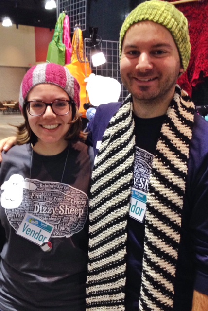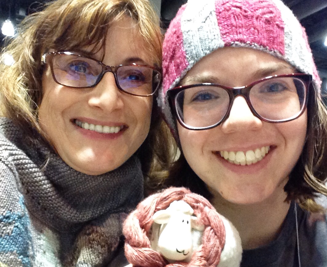 Re-united with Sarah Jaworowicz, who book designer for “Annetarsia Knits”. She worked in the Dizzy Sheep/Village Yarn and Fiber booth, and we are posing with Dizzy, who you may recognize from his commentary in pages of the book.