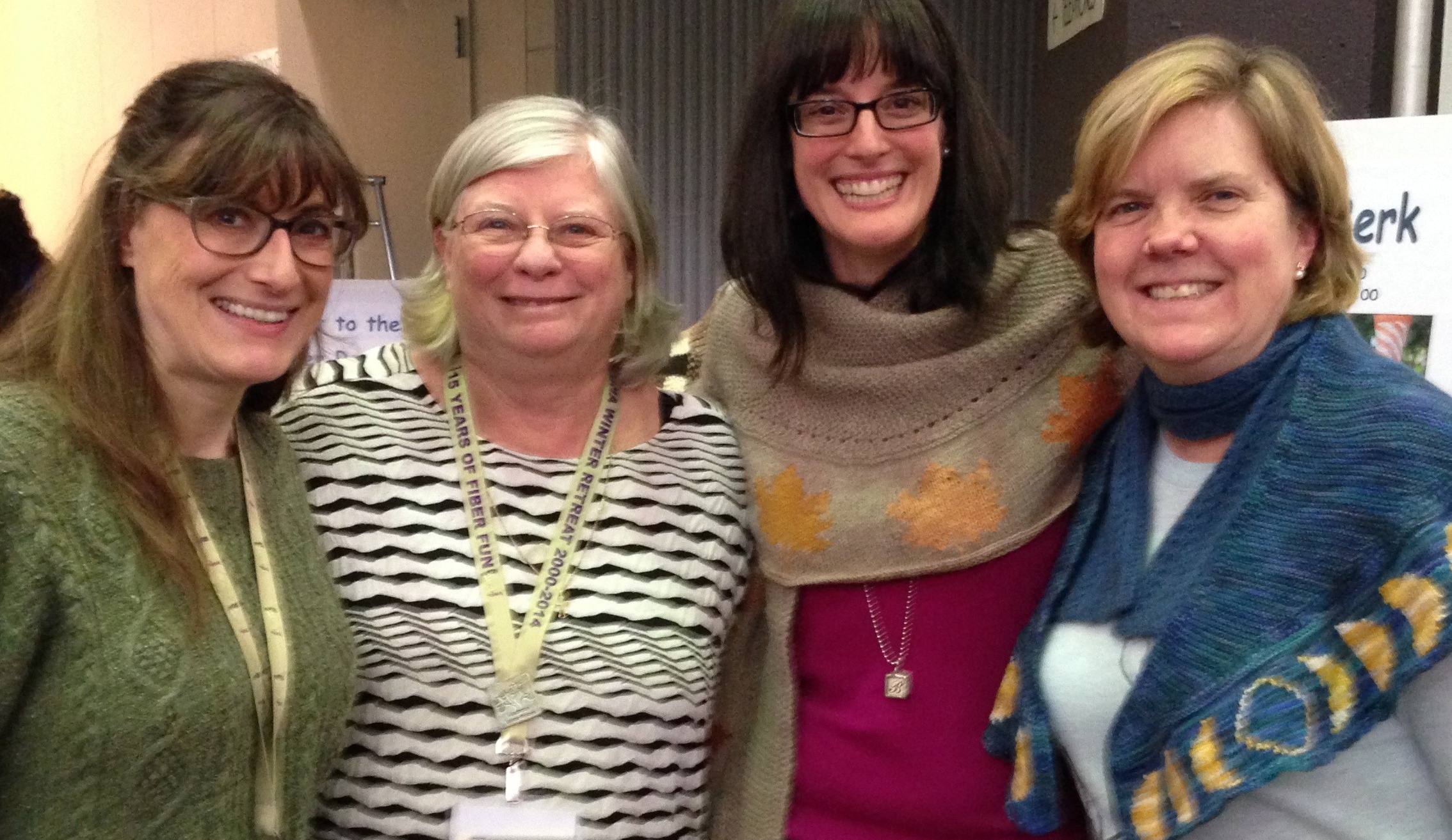 Once there was a group of knitters that met on Sunday afternoons at Molehill Farm.   Owner Cheryl Huffman retired and closed the store several years ago, but we decided that we weren’t ready to stop getting together. Val Allen, Elaine Blatt and Jill Betts were knitting students of mine who became friends.  Stephanie Fleming joined the group a few years later, after meeting Elaine at work.  As knitting groups go, we are pretty typical.  We all have very different lives and interests, except for knitting, which we all love passionately.  This is one of the best things about the craft, how it will introduce people to each other who might never have met otherwise.