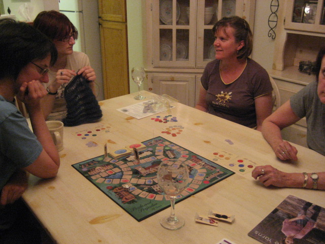 Jill, my daughter Deborah, Elaine and Val. We were playing a Pride and Prejudice board game…and knitting, of course!