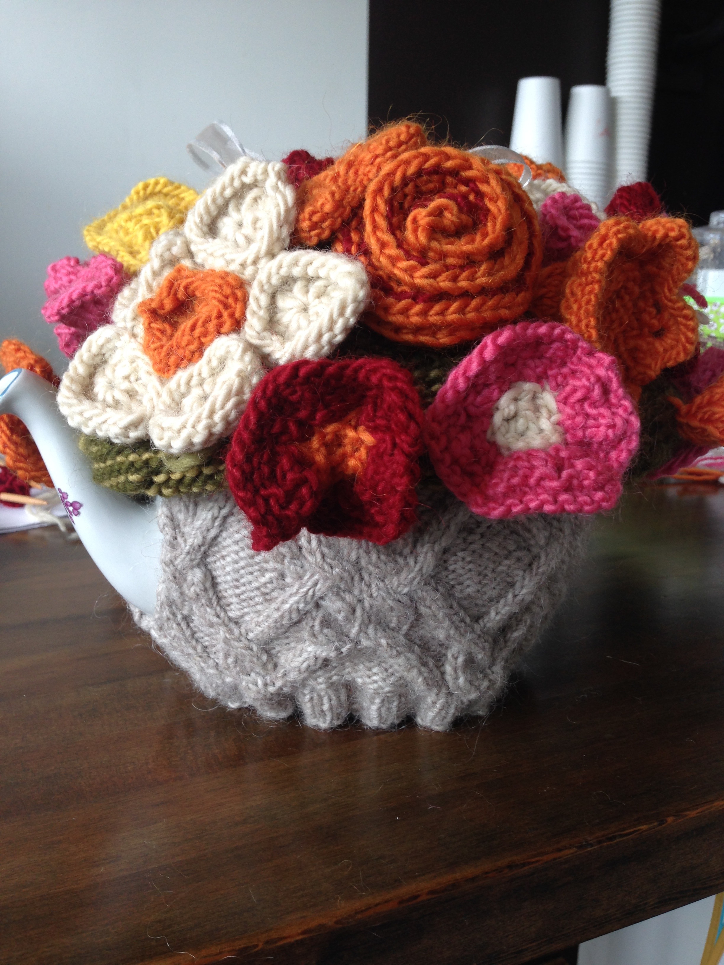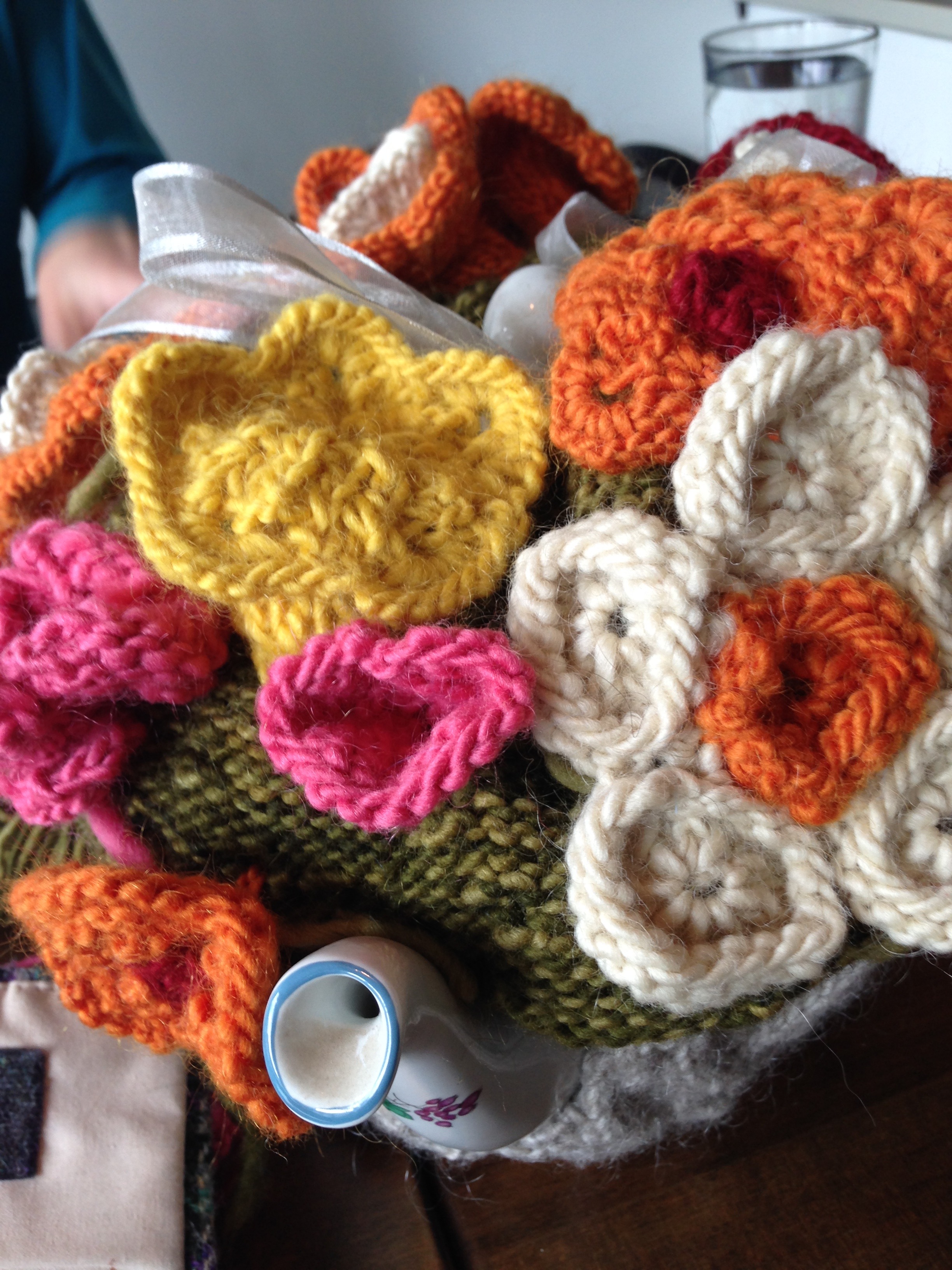 So, this year we got together and brain-stormed about what we were inspired to think about what Jane Austen would knit.  I was finished with “Annetarsia Knits” and ready to concentrate on a team project.  Similarly, life had quieted for the rest of the group.  So we worked together to create a tea cozy that would be fun to knit and have something that could be knit by a family or friends, with several parts.  The body of the tea cozy was to look like a basket filled with flowers.  We all participated in swatching and knitting.  We divided up the yarn, and communicated by e-mail as we worked on patterns for the flowers.  When we finally got together to assemble the project, it was amazing to see it come together.
