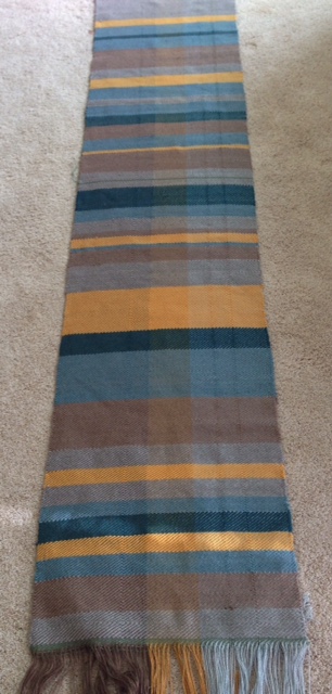 I finished the pillow fabric I’ve been weaving on the floor loom. When I took it off the loom I was amazed at how much fabric there was. Even though I was measuring as I went, 90″ of fabric is a lot when it is laid out. I had a wonderful time weaving, alone in the living room with my music playing. I’ve decided that it isn’t possible to have enough bobbins. No matter how many you have wound, they weave up so fast and then you have to stop weaving to wind more. But that is OK, I enjoy every process in weaving, so far. I am going to have to cut the fabric and sew up the pillows…sometime. I can’t bear to do it just yet. I am going to enjoy it as it is, for just a little bit.