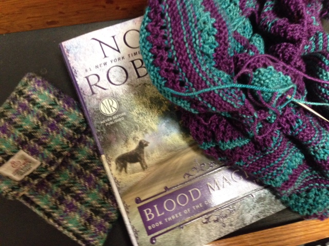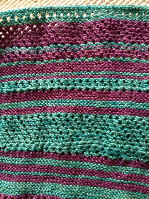 I’ve been working on the Blue Moon Mystery Knit-a-long project, but got sidetracked, so fell behind on the Clues. Now it has been revealed as “Off-Kilter”, and once I saw the finished project I decided that I could really go off-kilter if I wanted to. So I added some more short-rows here and there, and didn’t worry overmuch about following the pattern. Also, I like big shawls, so kept knitting until running out of yarn. Now I am at that point, and starting the i-cord bind-off. With about 400 sts on the needle, that will take awhile.