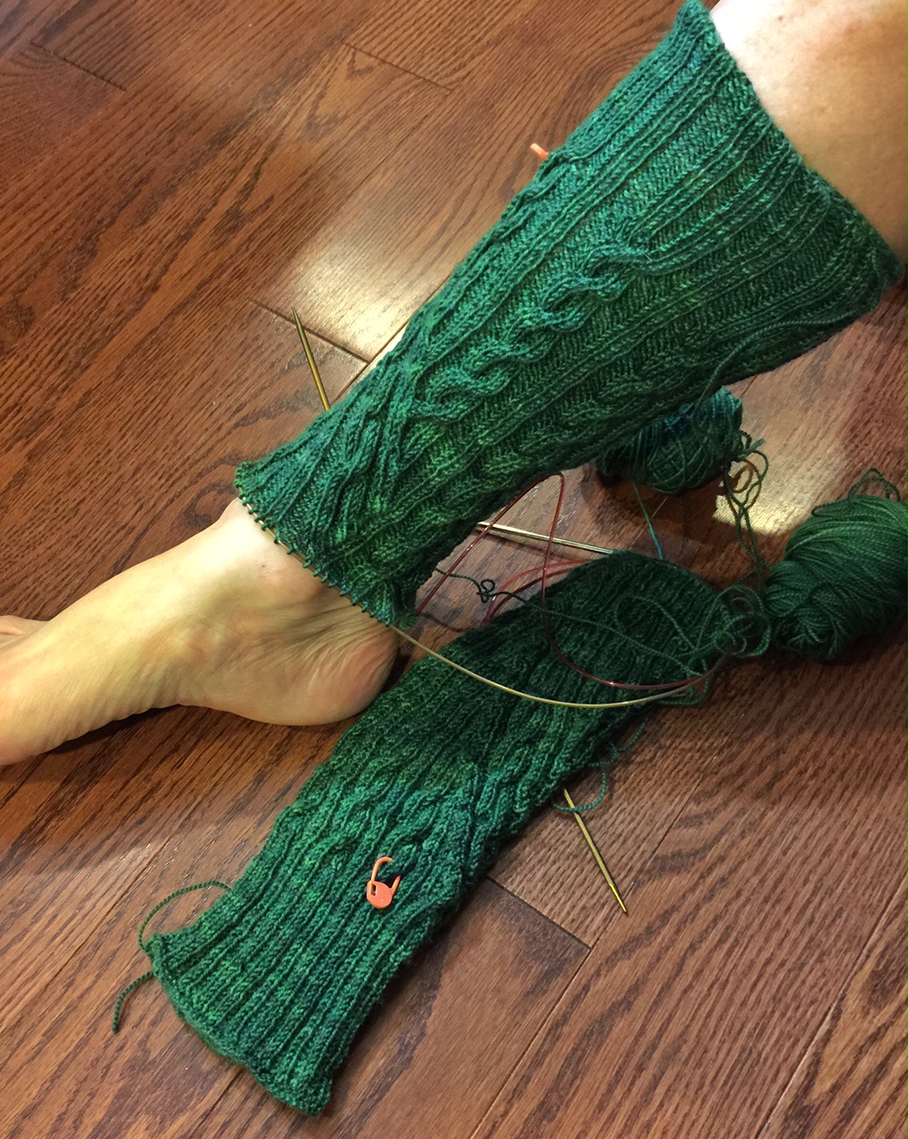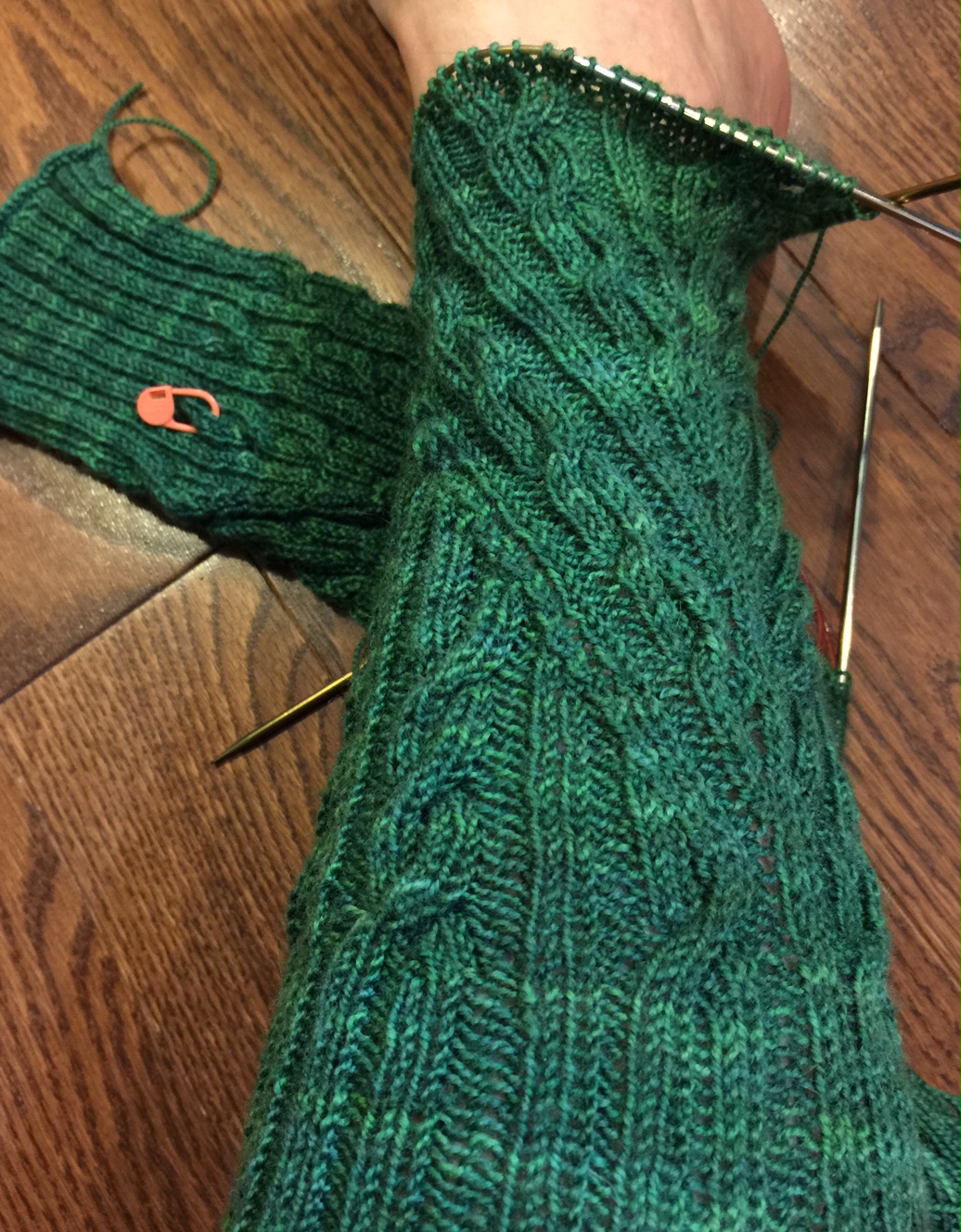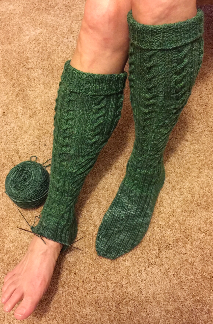 Uh, no.  The really complex patterning was done, but the leg was only a bit more than half-way finished.  I moved both socks to one long circular, because two-at-a-time is OK for me on a magic loop, but 2 circulars are too messy for me.  I kept knitting, and knitting, and knitting, until reaching the end of the chart.  Then I put got out the dpn’s and decided to finish one sock at a time.  When finished and blocked, they will come up to the knees.