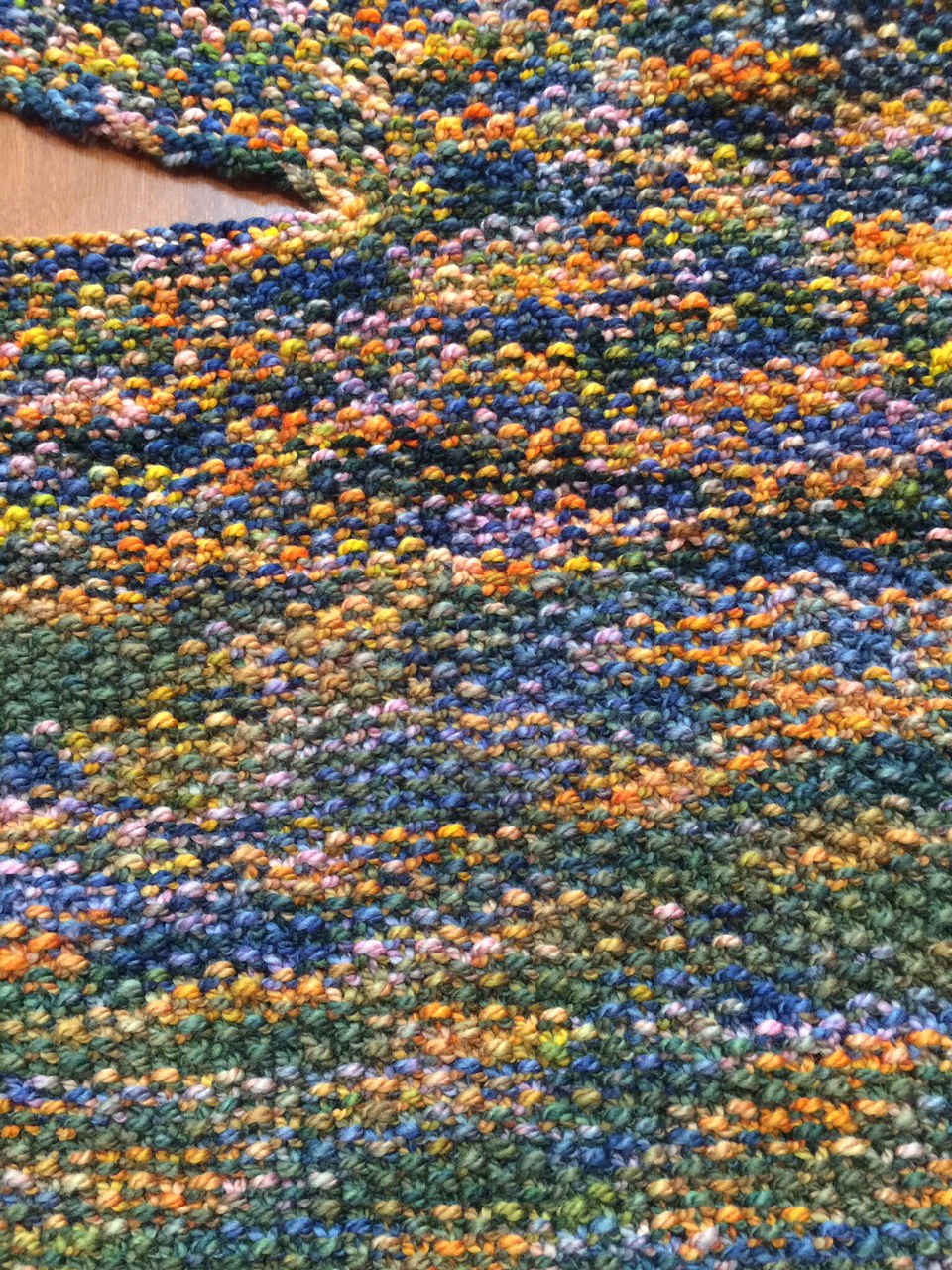 You can see where I changed skeins, as the colors shift. This happens with hand-dyed yarns, and I embrace the effect on this project, as I think it adds to the feeling of a varied skyline. The greener skein feels more like ground, and the bluer more like sky. I am loving this!Yarn: Knitting Boutique Anacostia Worsted, Baltimore Skyline colorway. Pattern: L’enveloppe, Sally Melville. Have divided for neck, and am working to match the first side.