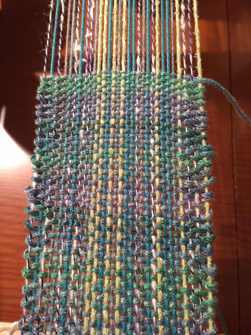 On the rigid heddle loom, I have stash leftovers on the warp, and am using a sparkly worsted weight for the warp. This is a narrow band which I have plans to ruffle and sew around a shawl. It’s playtime, so we will see what happens!!Playing with treadle patterns with a standard 1,2,3,4 threading. Warp is Cotlin (brown), linen (yellow), and an unknown fiber (blue). Weft is all Cotlin. I started with white until I was bored, and am now working with Blue.