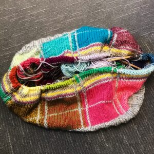 This sweater was knit with a specific sampler of yarn, but you could make one with leftover stash if the yarn was all equivalent weight.  I’m not going to write this up as a pattern, but here is a link to my notes and chart, if you want to see what I did.   ‘ square sweater notes.  Click here for the link to my Ravelry project page.