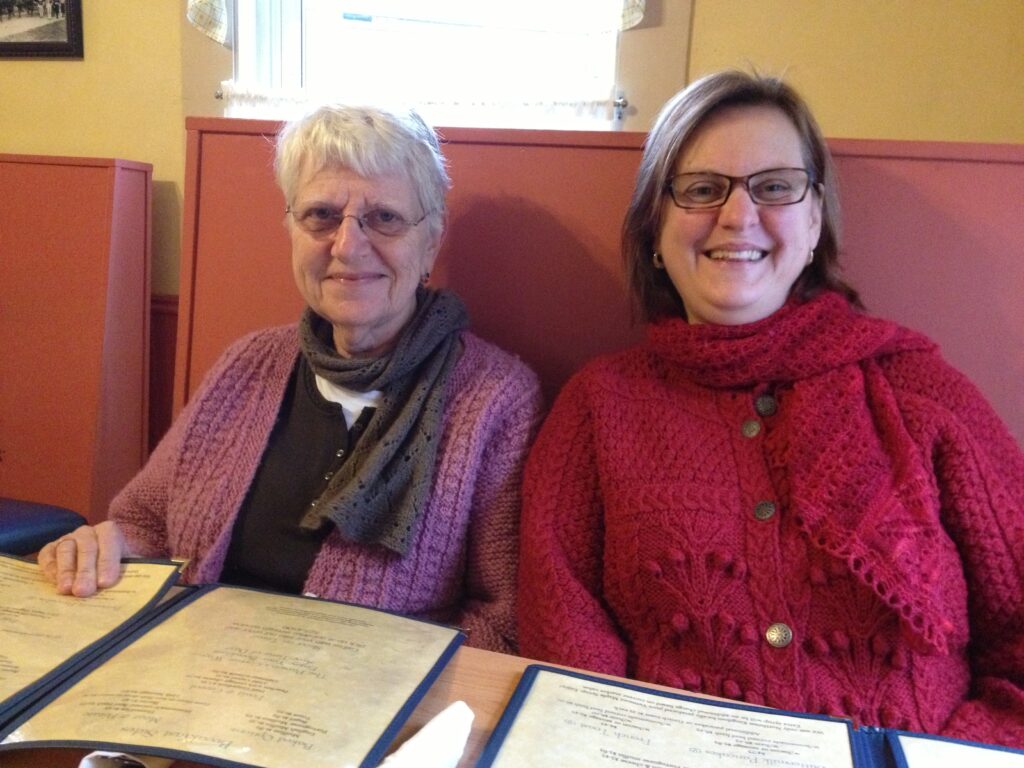Donna Druchunas and her mother, Joyce, at their favorite cafe for breakfast. Handknit sweaters, of course!