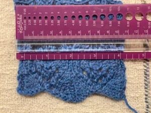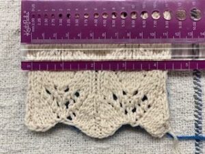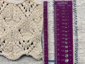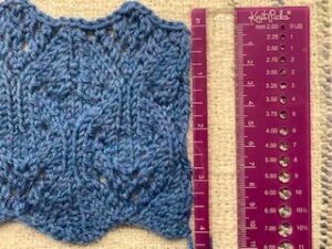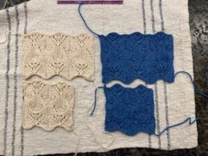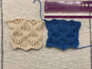 The second set of swatches knit up faster than the first set because of an important and encouraging factor. I am starting to get used to the lace chart. It isn’t memorized yet, but I’m familiar enough with it now to be able to knit without constantly checking my chart. I can hold a conversation on WS rows, and read my knitting on either row to make sure that I am not going off into the weeds. With Swatch 1, I had to un-knit occasionally because I counted incorrectly. That didn’t happen once when knitting Swatch 2. I tell my students that swatching lace helps you to decide if this is a chart you want to spend hours knitting. Some charts are more fun to knit than others, for lots of reasons personal to each knitter and the mood they are in, at the time. Swatching is a dating game between the knitter and the yarn/needles/pattern. You have to all be compatible. After this second set of swatches, I am very comfortable and confident that when I cast on, this will be a pattern I will enjoy knitting twice. The cotton sweater will be a different experience to knit than the merino, so I know I won’t be bored. I’m very much looking forward to the adventure.