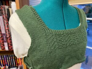 Normally, not matching row gauge isn’t a deal breaker, because we can add or subtract rows pretty easily to adjust body and sleeve length. But, in this pattern, row gauge is crucial for getting the set-in sleeve just right. Knowing that my blocked row gauge is what is called for gives me confidence that I can follow the pattern and will have a perfect set-in sleeve, although right now it looks like it would be too large. I am enjoying knitting the sweater, and am looking forward to adding those sleeves and seeing what happens!