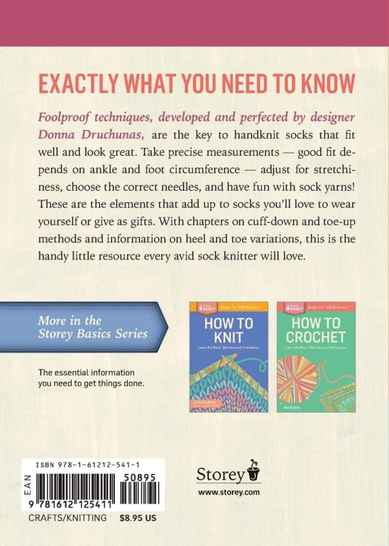 Whether you’re working socks from the toe up or from the cuff down, designer Donna Druchunas’s complete, step-by-step instructions make sock knitting easy, enjoyable, and successful. You’ll learn several approaches for getting started, and you’ll also discover how to shape comfortable toes, create heels that fit, and ensure stretchy cuffs that can be counted on to keep your socks up. Druchunas’s useful tips and tricks include working confidently with double-pointed needles, knitting socks on one or two circular needles, and even knitting two socks at the same time. Once you’ve mastered these basic techniques, you can adapt them to create your own custom sock designs.