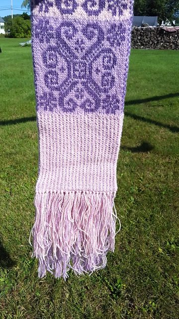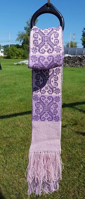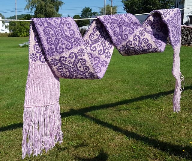 This scarf can be made at any gauge in any yarn. The basic pattern is written for 96 sts in the colorwork section. If you are working an all-over pattern around the entire scarf, you can inc a few more or a few less sts after the ribbing. In many books from Lithuania, Latvia, and Estonia, the author advises that it is more important to get a desired size than to have a full repeat of the pattern at the end of the round. It is perfectly acceptable to have a visible “seam” at the side edge of the scarf.