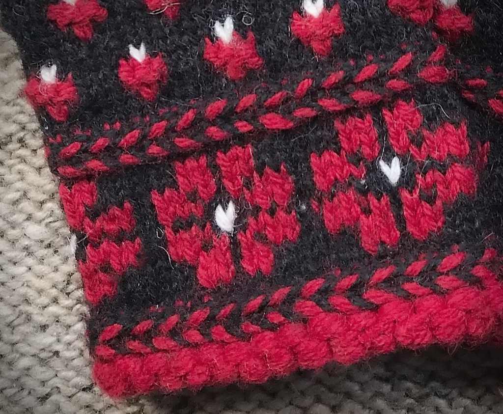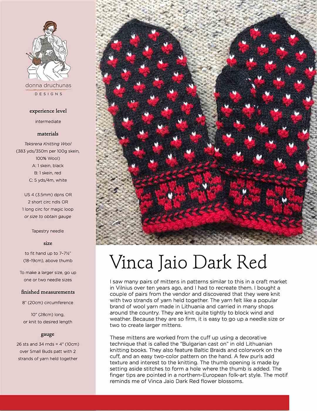 These mittens are worked from the cuff up using a decorative technique that is called the “Bulgarian cast on” in old Lithuanian knitting books. They also feature Baltic Braids and colorwork on the cuff, and an easy two-color pattern on the hand. A few purls add texture and interest to the knitting. The thumb opening is made by setting aside stitches to form a hole where the thumb is added. The finger tips are pointed in a northern-European folk-art style. The motif reminds me of Vinca Jaio Dark Red flower blossoms.