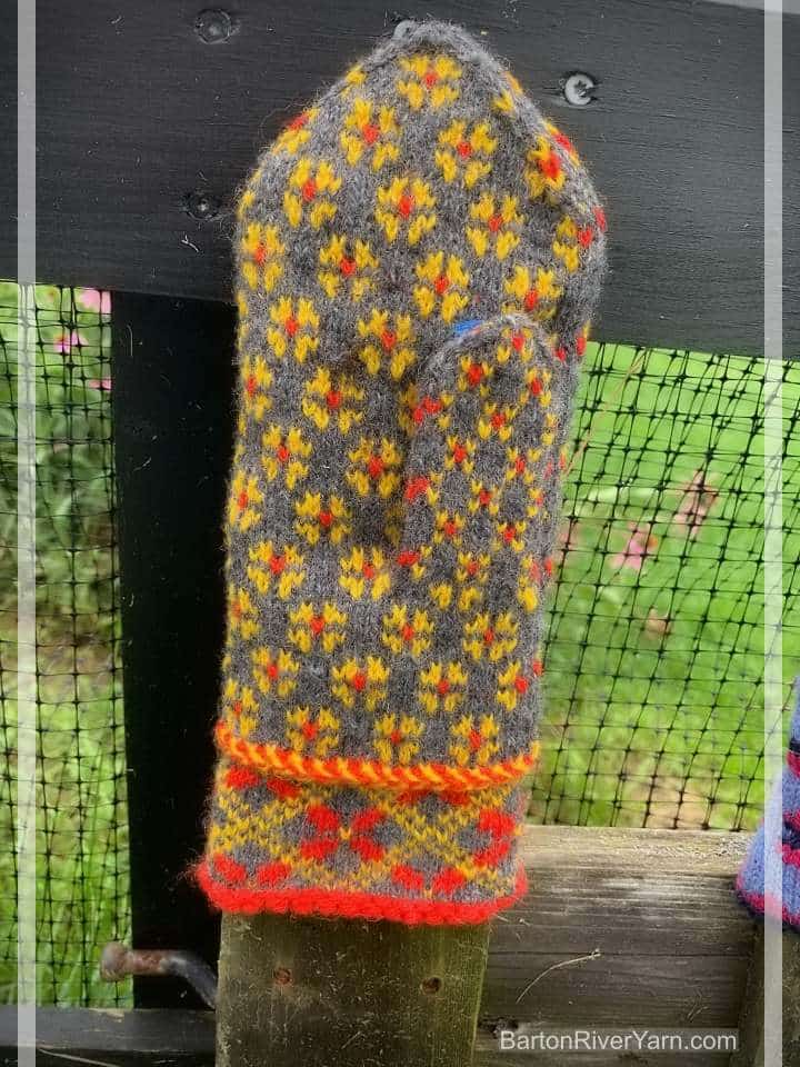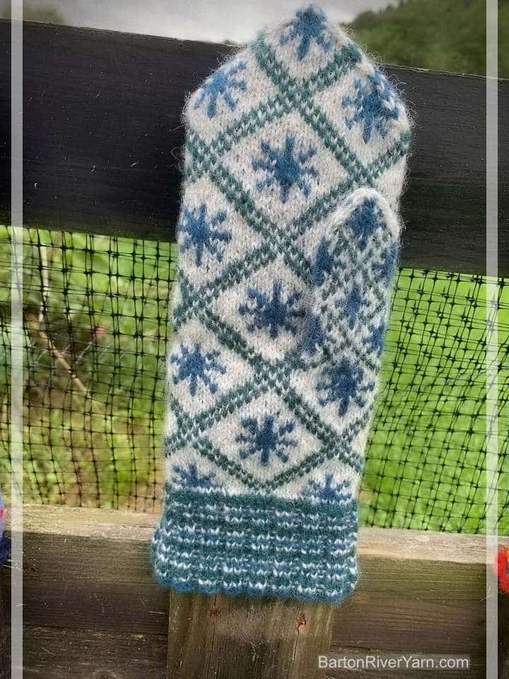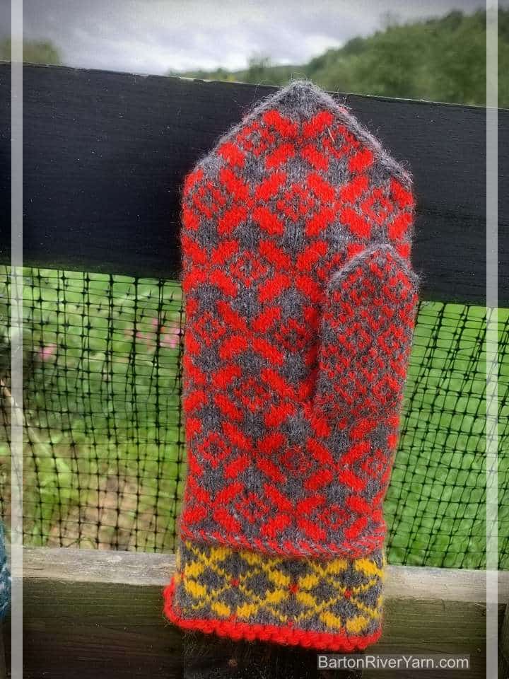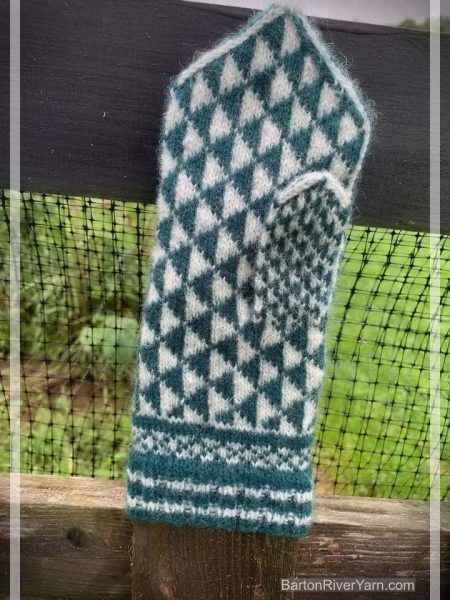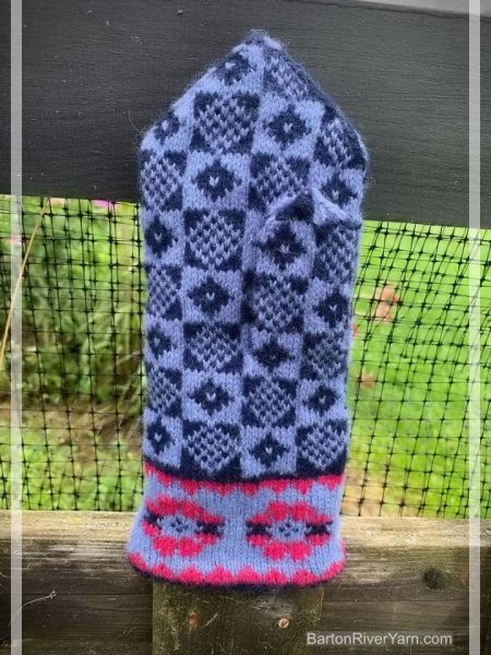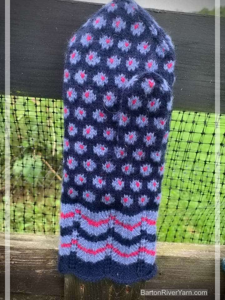 Mittens are worked with a simple lace pattern and Baltic Braid decoration on the cuff. Hand is stranded colorwork. Book includes link to video playlist as well as written techniques and instructions for modifying the size and design.